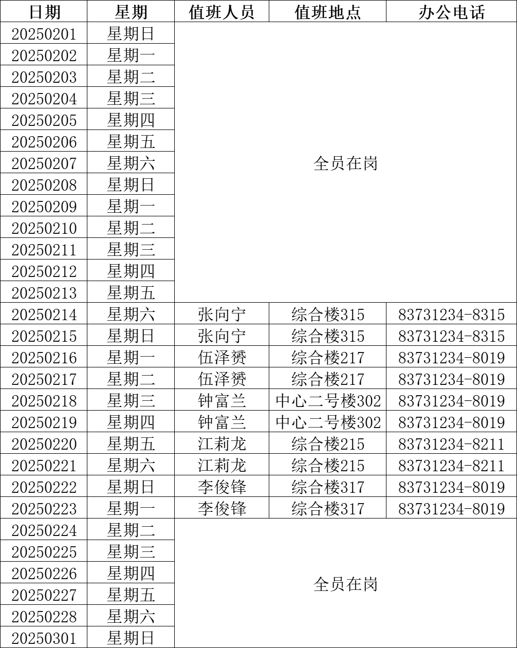 根据学校寒假工作安排,寒假期间(2月1日至3月1日),为方便广大教职工开展科研实验等事宜,中心安排老师值班。假期遇突发情况及时与值班老师或李老师(17706080090)联系,值班安排如下: